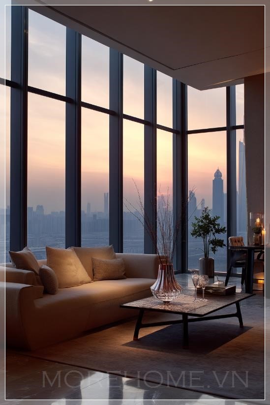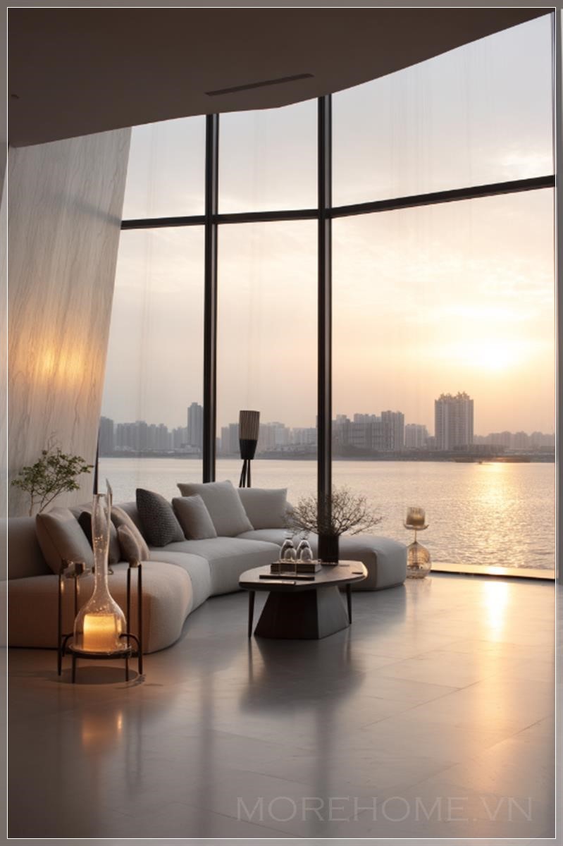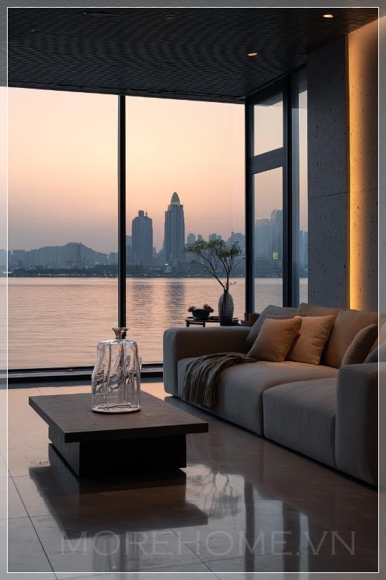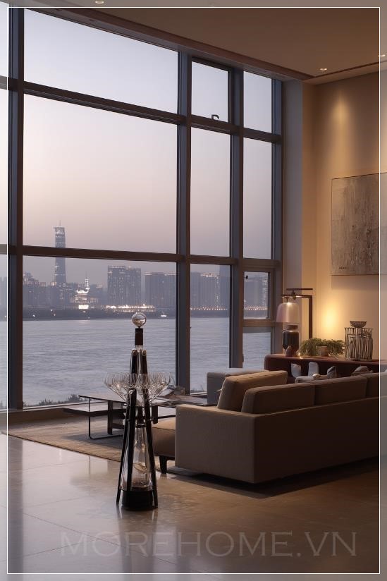 Phòng khách rộng lớn với cửa sổ từ sàn đến trần, một chiếc sofa và bàn cà phê ở trung tâm, trên bàn là một giá đỡ rượu bằng kính thanh lịch với chân cao. Phía sau là cảnh quan toàn cảnh sông Qiantang và đường chân trời thành phố Thượng Hải vào lúc hoàng hôn. Phong cách thiết kế nội thất là tối giản, với ánh sáng dịu nhẹ tạo nên không khí ấm áp.