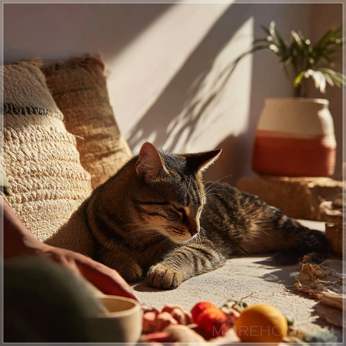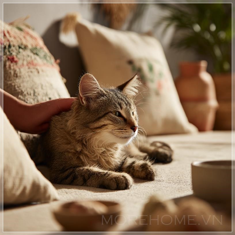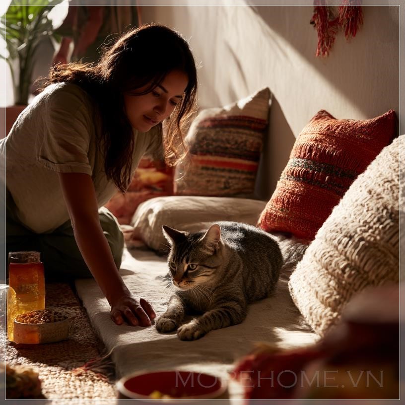Cận cảnh một con mèo mới được nhận nuôi đang nghỉ ngơi trên một chiếc ghế sofa thấp, xung quanh là phòng khách tràn ngập ánh sáng mặt trời, một bàn tay người nhẹ nhàng vươn ra để trấn an, gần sát khung hình, phần còn lại của cơ thể người hơi mờ nhạt, với trang trí tối giản trong các tông màu đất, một chiếc gối đan tay, một chậu cây trong bình đất sơn, và vài món đồ chơi và bát đựng thức ăn cho mèo được rải rác, gợi lên một vẻ đẹp nhẹ nhàng mang phong cách Mexico, Canon EOS 6D Mark II, 24-70mm f/2.8 lens, khoảnh khắc này ghi lại một sự kết nối im lặng, mong manh nhưng đang phát triển, với ít vải và đồ đạc trong không gian.