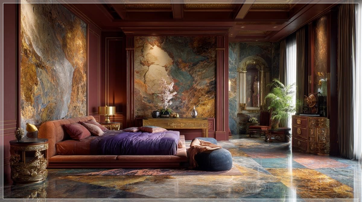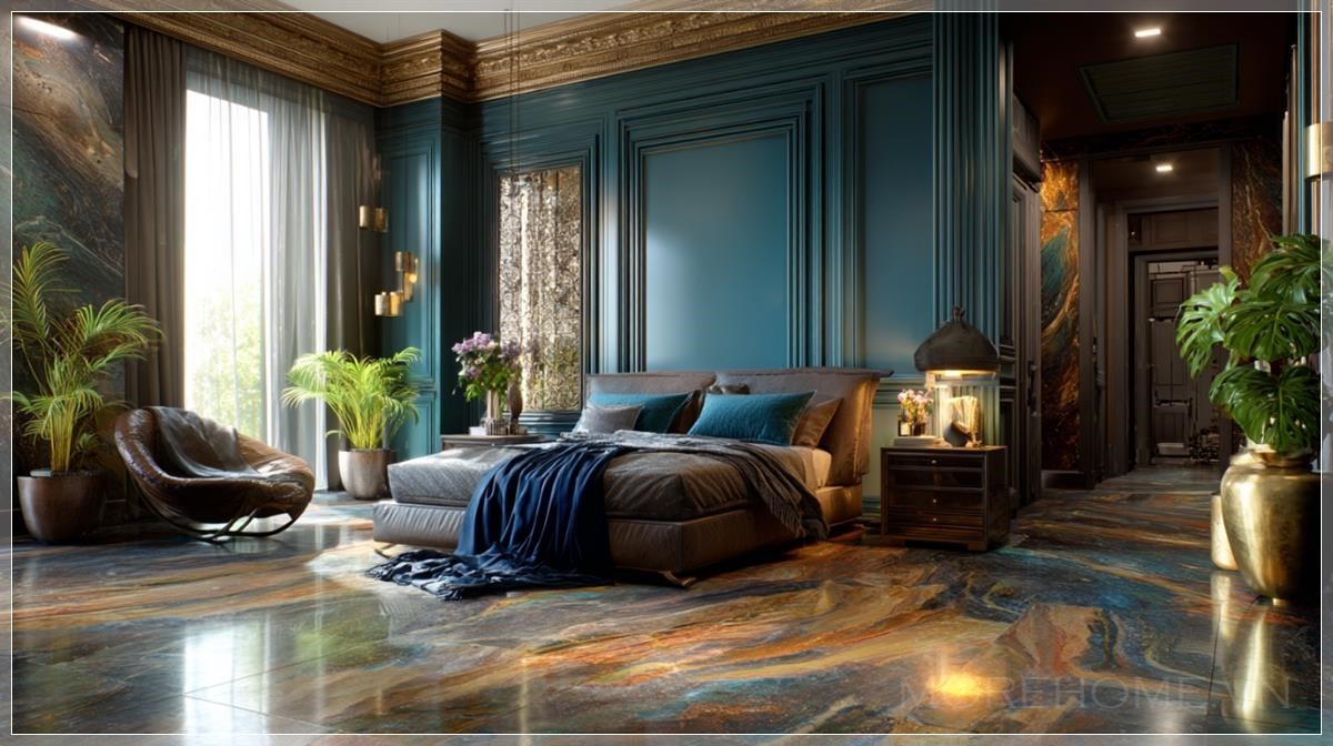 Trong không gian phòng ngủ sang trọng này, từng chi tiết được thiết kế tỉ mỉ để tạo ra một cảm giác ấm cúng và đầy sự tinh tế. Sàn nhà được lát bằng đá hoa cương sáng bóng, phản chiếu ánh sáng nhẹ nhàng, tạo nên một bầu không khí mượt mà và đầy sang trọng. Những vân đá tự nhiên trên mặt sàn càng làm nổi bật vẻ đẹp của không gian, khiến cho mỗi bước đi trở thành một trải nghiệm thư giãn.