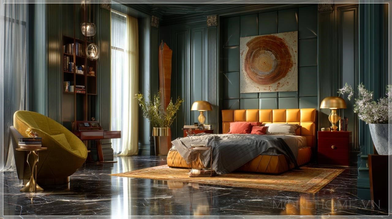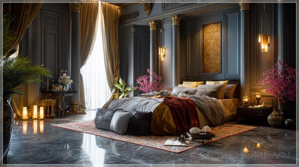 Điểm nhấn của căn phòng là ánh sáng dịu dàng chiếu qua cửa sổ lớn, chiếu sáng không gian trong một sắc thái huyền bí và lôi cuốn. Bức tường phía đối diện với giường được thiết kế theo kiểu dáng kiến trúc mạnh mẽ, với những đường nét cứng cáp nhưng không kém phần tinh tế. Toàn bộ không gian tạo nên một sự kết hợp hoàn hảo giữa vẻ đẹp cổ điển và hiện đại, mang đến một không gian ngủ ngọt ngào và thư thái.