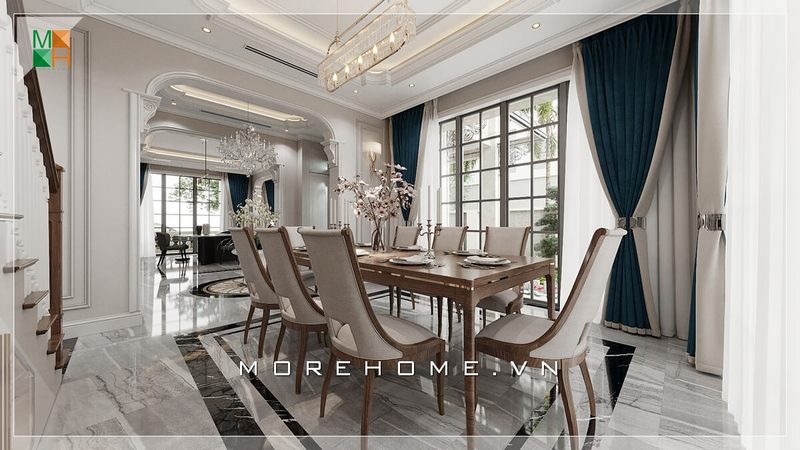 Trong thiết kế không gian phòng ăn biệt thự theo xu hướng hiện đại, sự có mặt của đèn không chỉ để chiếu sáng mà còn có hiệu ứng thị giác kích thích sự vui thú mỗi khi các thành viên sum vầy. Trong đây kts Morehome đã sử dụng ý tưởng dùng đèn chiếu sáng dạng lục giác với 6 đỉnh tựa như bông hoa đang bung nở khoe sắc, và sẽ đẹp hơn nếu thể hiện đúng thời điểm, và hiển nhiên trong mỗi gia đình hiện đại, trong 1 ngày làm việc bận rộn thì bữa tối lại là bữa chính và quan trọng nhất để nghệ thuật ánh sáng được phát huy tác dụng của mình.