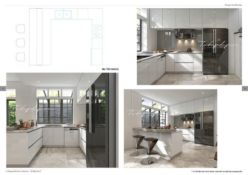 Tủ bếp hiện đại vuông vắn gọn gàng để bố trí cho phòng bếp của căn hộ chung cư ngăn nắp, tiện lợi.