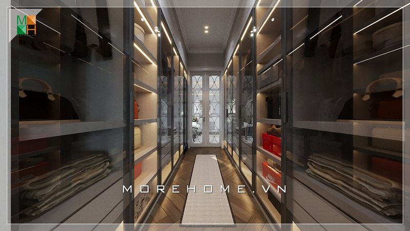 Mẫu tủ quần áo được thiết kế chạy dài, kết hợp giữa kính và gỗ, có chia ngăn tiện lợi và bố trí song song thuận tiện cho việc cất, lấy đồ của gia chủ.