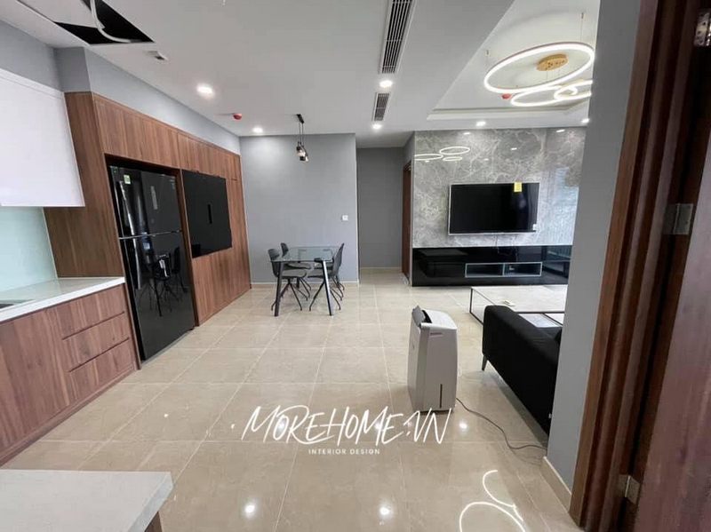 Khi chúng ta mở cửa vào bên trong tầm mắt ta đã phải chú ý tới trang trí của chung cư được thi công hoàn thiện từ bản vẽ của các kiến trúc sư Morehome sự kết hợp mở giữa không gian bếp và phòng khách khá độc đáo mà hề bị khó chịu về sự chật trội.